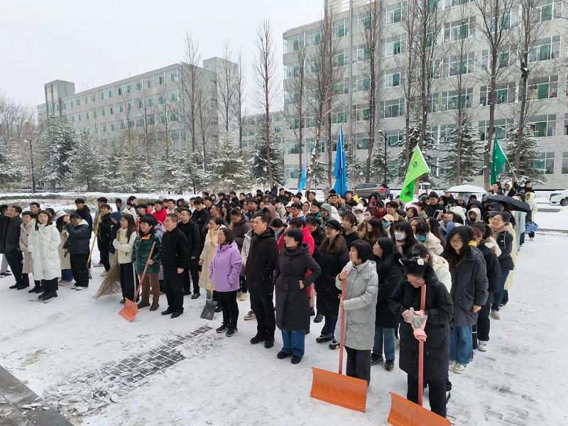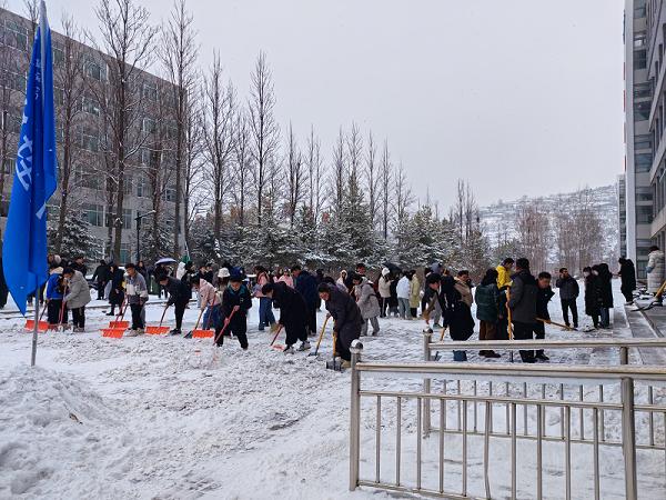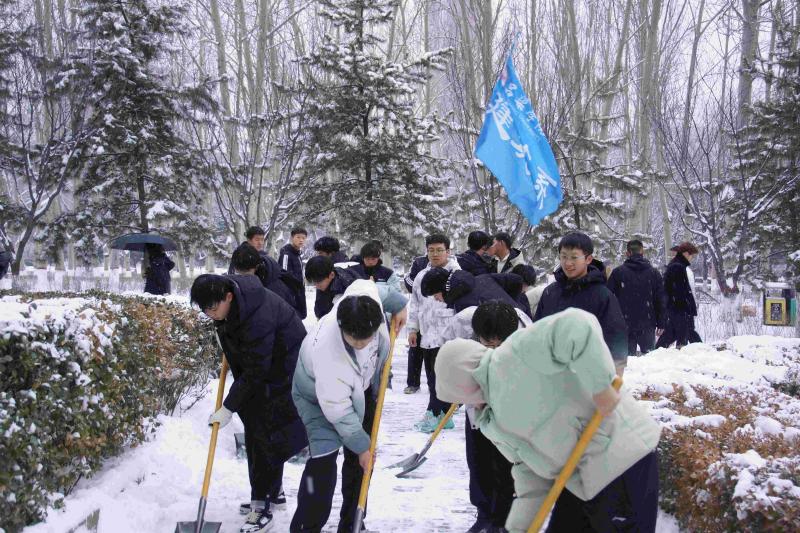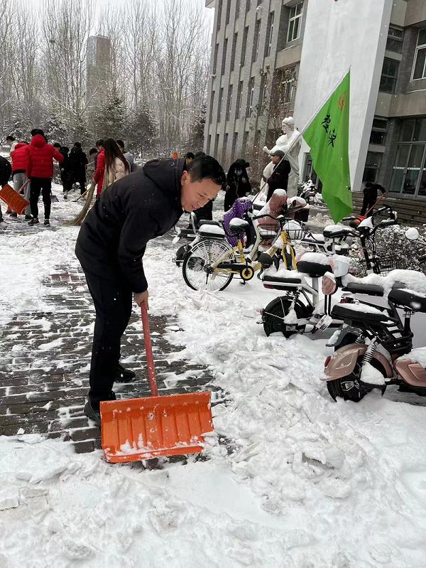 四个党总支的师生党员冒着风雪,不畏严寒,我拿扫帚,你拿铁锹,铲的铲、扫的扫、推的推,大家团结协作,齐心协力,干得热火朝天,忙碌的身影在白雪皑皑的校园中构成了一道亮丽的风景线。