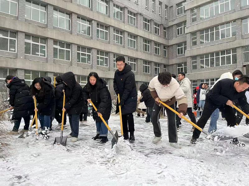 经过一个多小时的奋战,大家将通往弘博楼A座和B座所有门前主干道及附近道路积雪全部清除,为广大师生开辟了一条条安全出行道路。