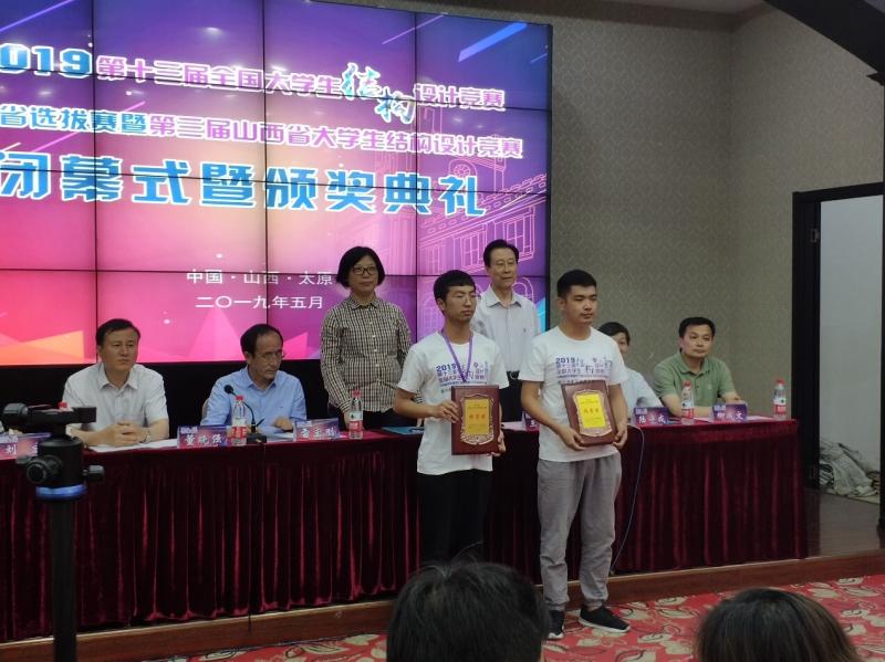 5月26日,为期四天的第十三届全国大学生结构设计竞赛暨山西省第三届大学生结构设计竞赛在山西大学胜利落幕,在我系高树峰主任、崔彩萍副主任、宋季耘老师、闫晓彦老师、胡晓红老师、五位老师的共同指导下,由邓义、游志茹、左峰、乔康乐、杜万里、贾思聪、滕杰、杨晟、安鹏杰九位同学组成的tyc41183太阳成集团参赛队发挥出色,在全省13所高校的32支代表队伍中脱颖而出,荣获特等奖(第一名)、二等奖、三等奖的好成绩;并且获得代表山西参加全国总决赛的资格。