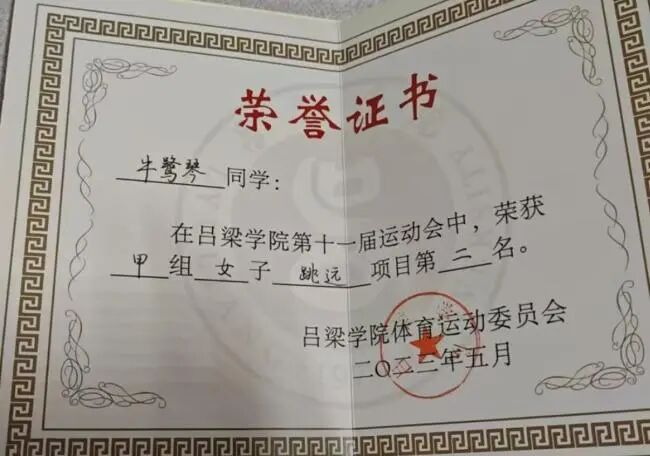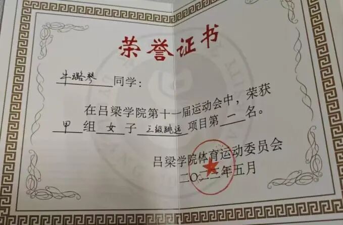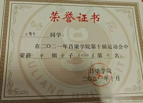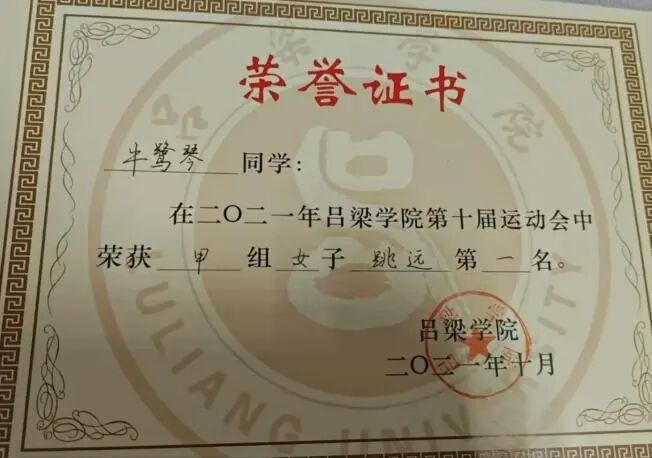 其他:2021年10月获tyc41183太阳成集团第十届甲组女子三级跳远第一名