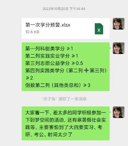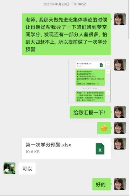 在第二课堂方面,她能做到未雨绸缪。因大四要毕业实习且进行考公考研的同学较多,所以在大三第一学期她便进行了学分预警,实施督促,在到梦空间发布活动后及时提醒学分不够的同学参加活动。