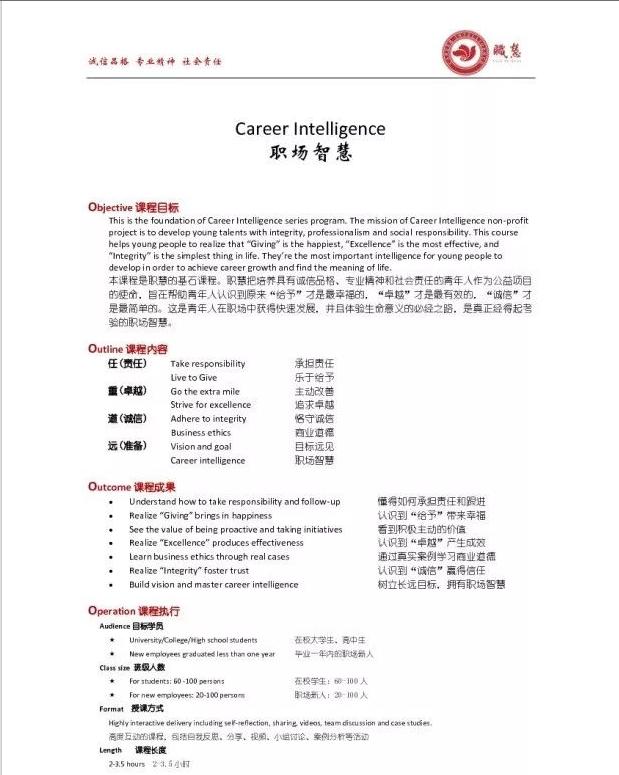 职慧 Career Intelligence,全称“北京职慧公益创业发展中心”,是北京市民政局注册的非营利社会服务机构。成立于2011年,致力于通过专业的生涯发展与职业素养课程、教练式导师辅导等,培养“做自己、能担责、有力量”的中国青年,助力每个青年都活出生命价值。职慧讲师与导师均为来自企业的志愿者,秉持着“Live to Give 给予,是种生活方式”的理念全志愿服务大中学生。