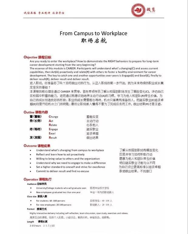 1.《主动领导》适合有带团队经验的学生、学生干部、社团负责人参加。2.《职场智慧》和《职场启航》适合大三以上有实习经验的。3.《简历制作》适合大二及以上开始找实习及工作的同学,请同学们携带简历听课,跟随讲师同步修改简历更有效果,且有可能获得讲师1对1修改简历机会。4.《社交风格》适合所有的大学生。