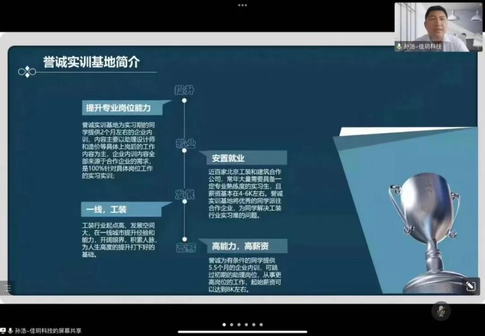 为切实帮助2023届毕业生解决实习就业问题,2022年5月21日上午10点,建筑系在腾讯会议召开了北京佳玥科技有限责任公司实习宣讲会,本次会议由誉诚实训教学总监孙浩主讲,建筑系就业专员薛楠老师及2023届毕业生参会。