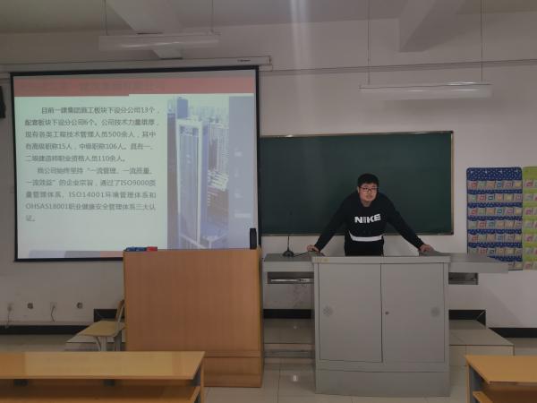 首先,西安建工一建集团通过播放宣传片、展示PPT等方式简单的向同学们介绍了公司的组织结构、现阶段以及未来的发展方向和人员需求等方面的实际要求。